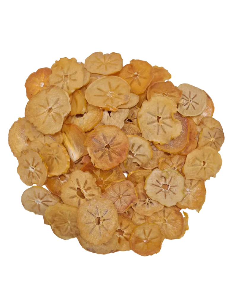 Kaki soigneusement sélectionné puis séché à basse température afin de préserver la couleur orange intense, la texture tendre et la douceur naturellement sucrée du fruit.